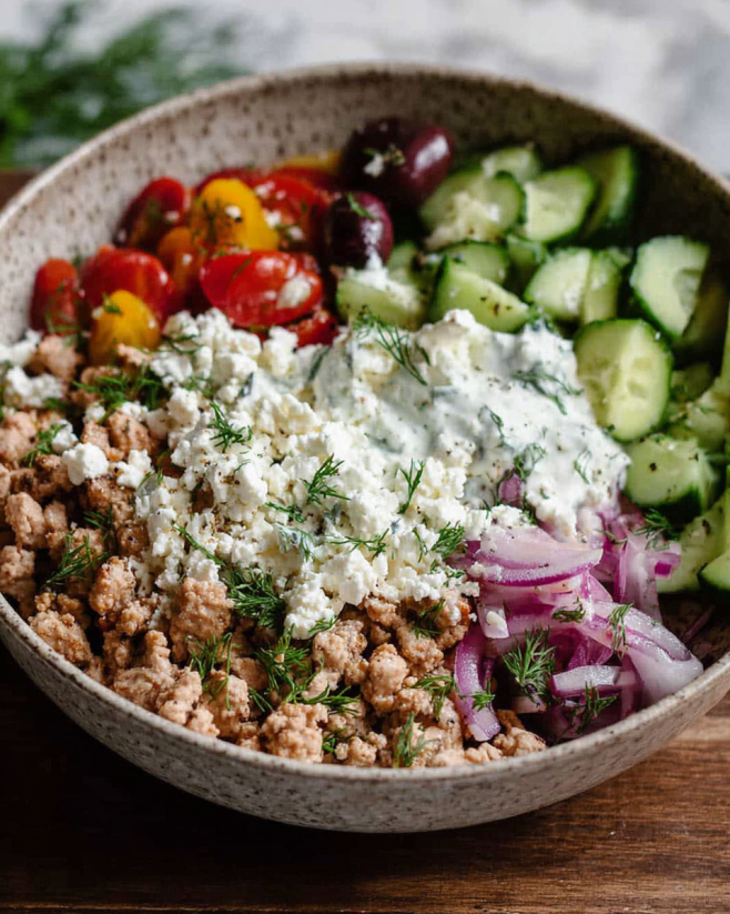 In conclusion, Greek Chicken Bowls with Ground Chicken are a delightful and nutritious meal option that brings the vibrant flavors of Greece right to your table. With their combination of lean protein, fresh vegetables, and zesty ingredients, these bowls are not only satisfying but also packed with essential nutrients. Whether you’re preparing a quick weeknight dinner or meal prepping for the week ahead, this dish is versatile and easy to customize to suit your taste.