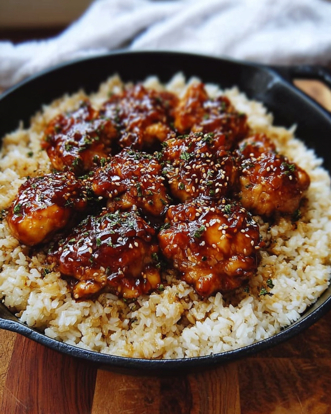 A delicious and easy meal combining tender chicken thighs with a sweet and tangy BBQ sauce, served over fluffy rice.