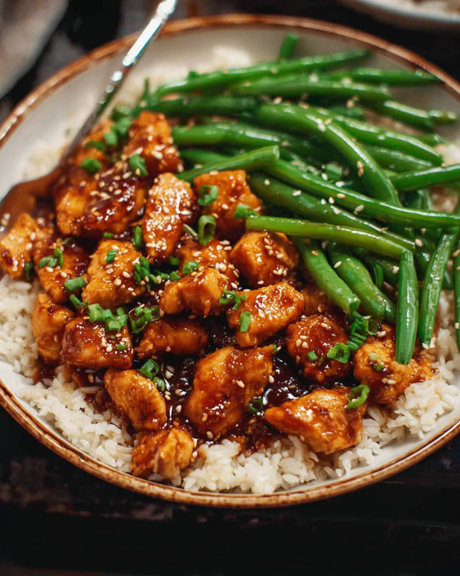 A delicious and easy meal combining tender chicken with a sweet and savory honey garlic sauce, complemented by crisp green beans.