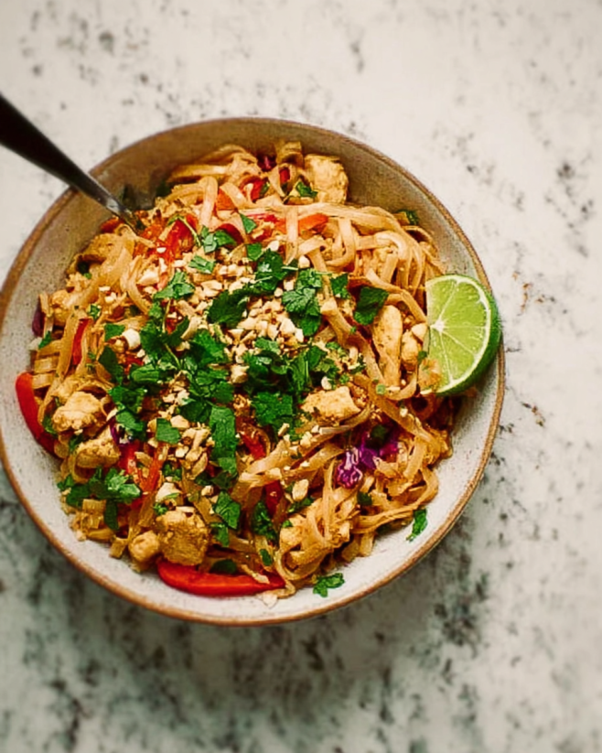 A delicious homemade version of the classic Thai dish, combining stir-fried rice noodles with chicken, vegetables, and a flavorful sauce.